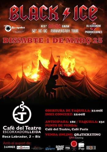Después del sold out del año pasado, BLACK/ICE regresa más fuerte que nunca para llevar toda su energía a la Sala Cafè del Teatre de Lleida! Este 1 de marzo de 2025, celebraremos el 50 aniversario de AC/DC con un show espectacular que te hará sentir como si estuvieras frente a la banda original.