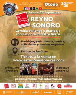 Comida Reyno Sonoro - Otoño 2025 Comida bailonga y maridaje con sabor de nuestra tierra. De la mano de Reyno Gourmet : Productos denominación de origen de Navarra Reyno Gourmet. Productos de calidad elaborados con mimo por personas que trabajan cada día por su tierra. - Degustación de vinos, maridajes, gastronomía, música, actividades, y más - 27 de septiembre Sábado Acceso con Entrada Aforo Reducido - Hora: 13:00 h. / Lugar: Parque San Juan de Cascante - Parrilla abierta. Concierto Travellin' Brothers, El Bosque Sonoro Djs y mas sorpresas. Próximamente toda la información de menú y horarios.