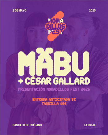 El próximo viernes 2 de mayo presentamos la programación completa de Moradillos Fest 2025 con una tarde/noche muy especial en el castillo de Préjano. Disfrutaremos de la actuación en directo de Mäbu y César Gallard en un entorno único del Valle del Cidacos, rodeados de música, amigos y muy buen ambiente. Además, habrá sorteos de abonos para el festival y nuevo merchandising. ¡No te lo pierdas! Entrada anticipada 8€. Taquilla 10€. Entrada gratuita para niños de hasta 12 años.