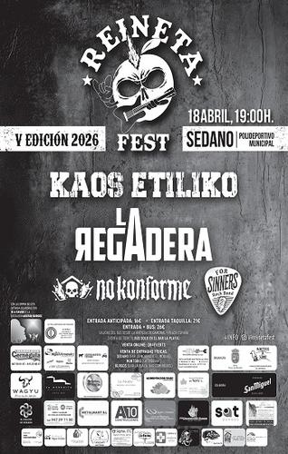 V Edición del ReinetaFest. Por su escenario pasarán las versiones de For Sinners, el punk rock de No Konforme con reciente disco: Rayo ke no cesa (2025), la mezcla explosiva de ritmos de La Regadera que harán vibrar al público y el ya clásico del rock, Kaos Etiliko. En definitiva, un cartel variado para asegurar la diversión y el disfrute.